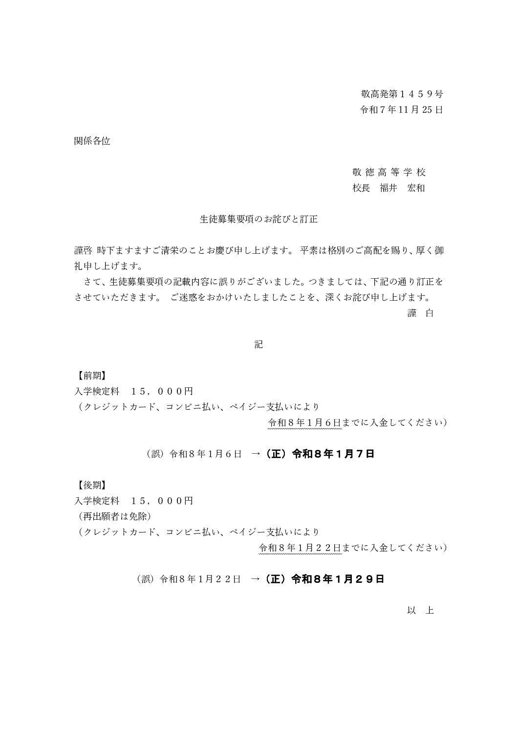 【お詫びと訂正】令和8年度生徒募集要項-入学検定料について